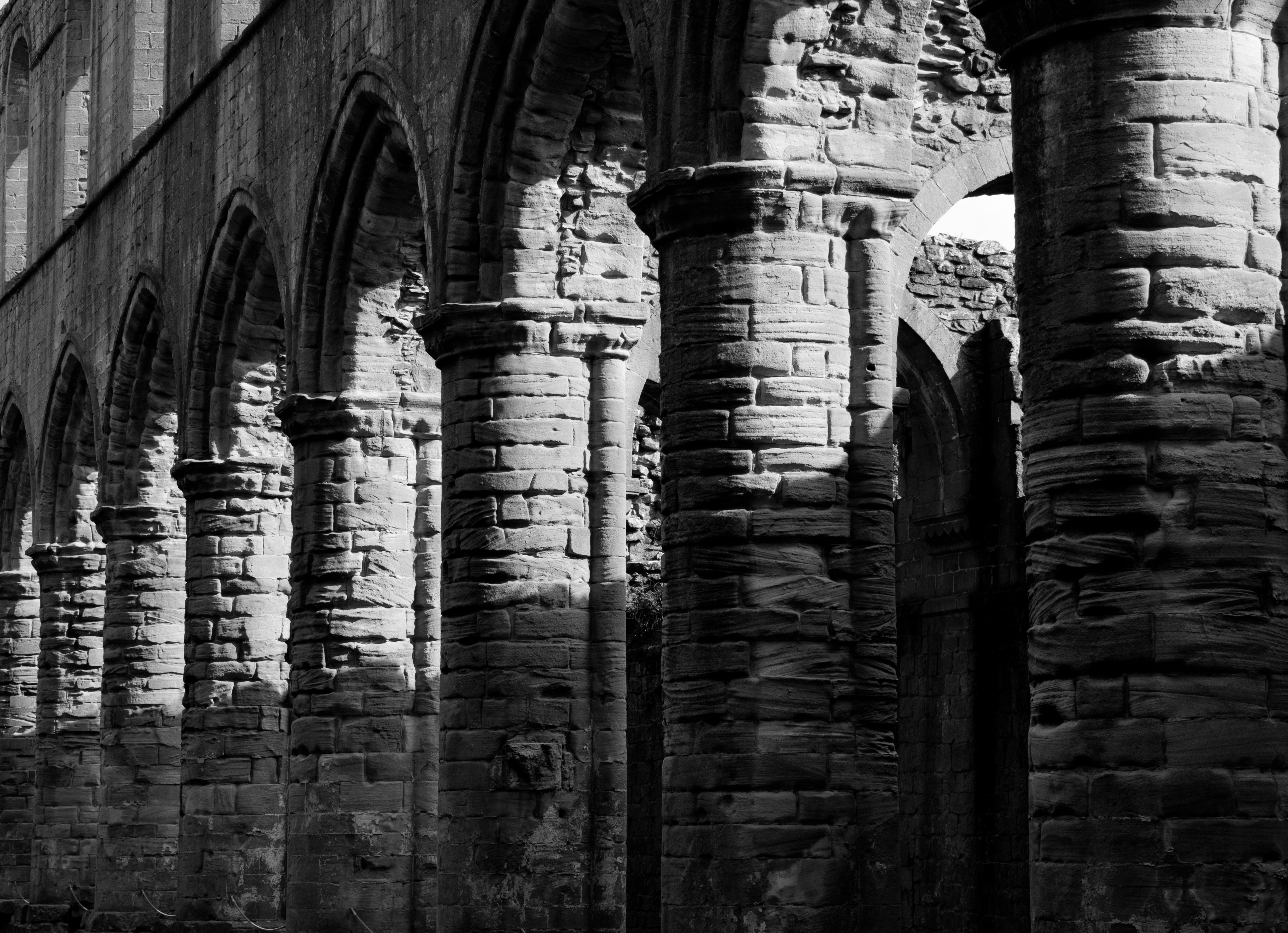 Arches along the ruined nave of Fountains Abbey, a Cistercian monastery built in 1132.