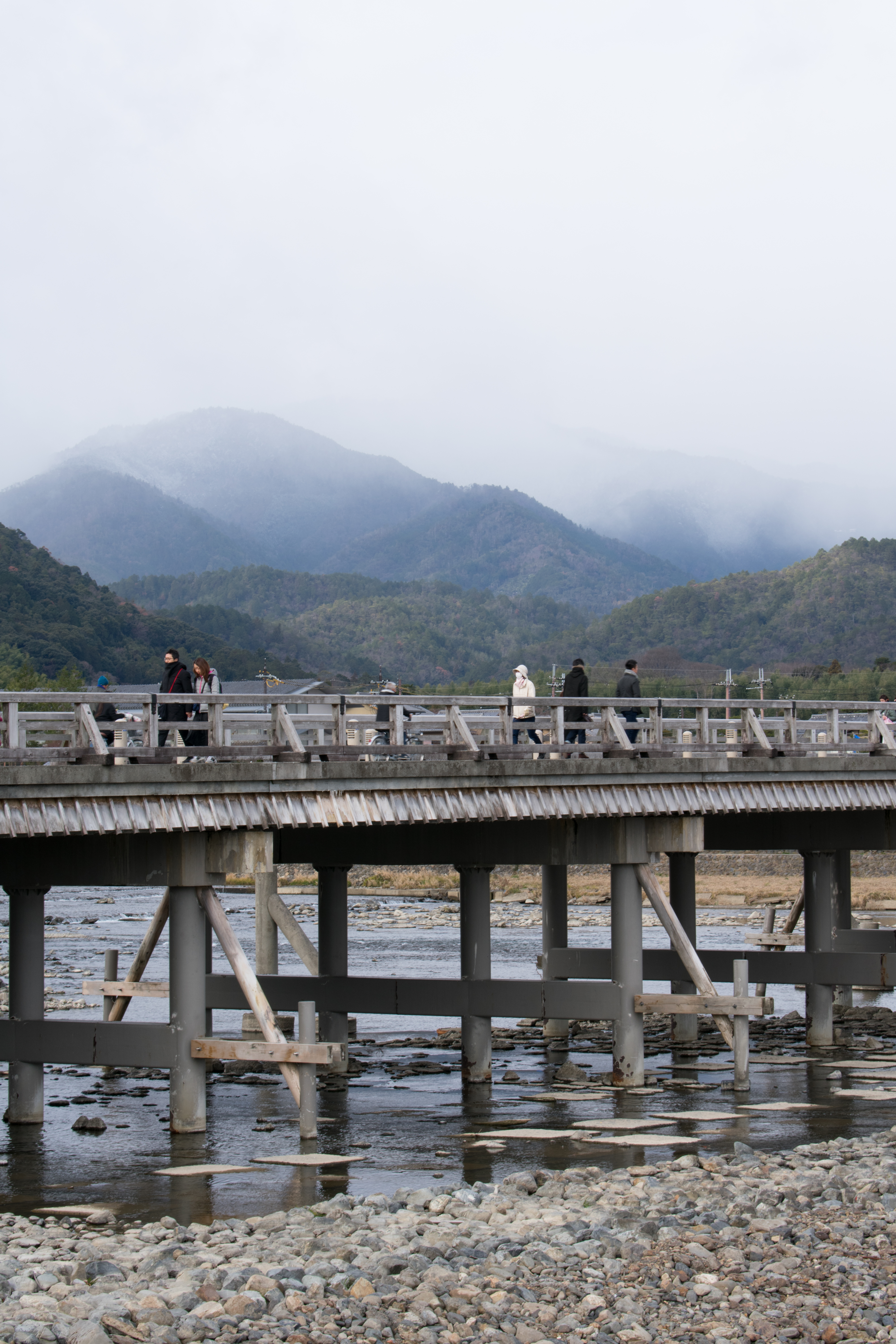 Low clouds hang over the mountains behind Togetsukyō bridge in Kyōto's Arashiyama district.